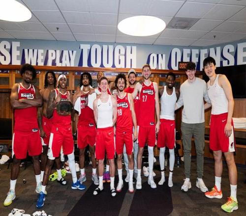 昨日对阵混音的比赛结束后,杨瀚森还参加了混音传统的赛后大合影活动。他站在最边上,搂住身旁的队友一脸微笑。