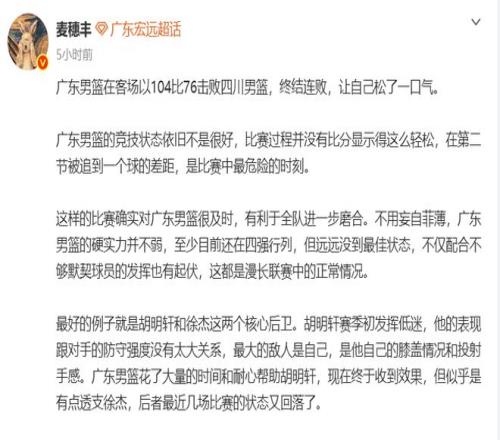 对于胡明轩和徐杰两种截然不同的场上表现,麦老师表示:胡明轩赛季初发挥低迷,他的表现跟对手的防守强度没有太大关系,最大的敌人是自己,是他自己的膝盖情况和投射手感。广东男篮花了大量的时间和耐心帮助胡明轩,现在终于收到效果,但似乎是有点透支徐杰,后者最近几场比赛的状态又回落了。