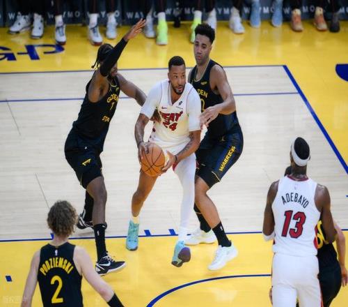 下半场易边再战,第三节勇士上来,连续打铁失误,阿德巴约外线三分终于进了。双方又是对攻大战,但巴特勒被撞到膝盖,痛苦倒地被队友架出场外。但巴特勒受伤以后,勇士反而打了一波12-0的小高潮,一举拉开分差到两位数,三节结束热火93-104落后11分。
