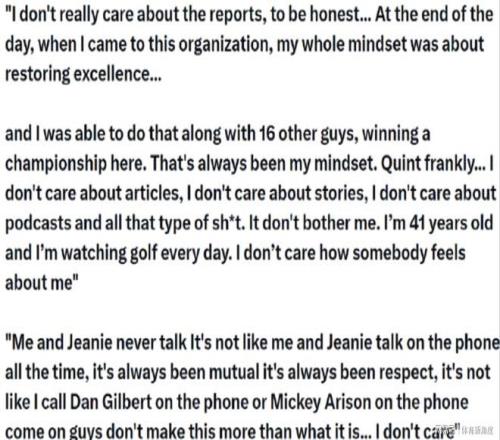 当被问到近期是否与珍妮·巴斯有过交流时,詹姆斯的回答十分干脆:“我们之间几乎没什么交流。我不明白,其实我和珍妮之前也很少打电话沟通,你们应该也没见过相关的报道吧。我不会把这种事小题大做,我们彼此尊重,双方一直保持着良好的合作关系。但我也不会特意给她,就像我从未给热火队老板米奇·阿里森或者骑士队老板吉尔伯特打过电话一样。得了吧,各位,别把这事儿无限放大了,我真的不在乎。”