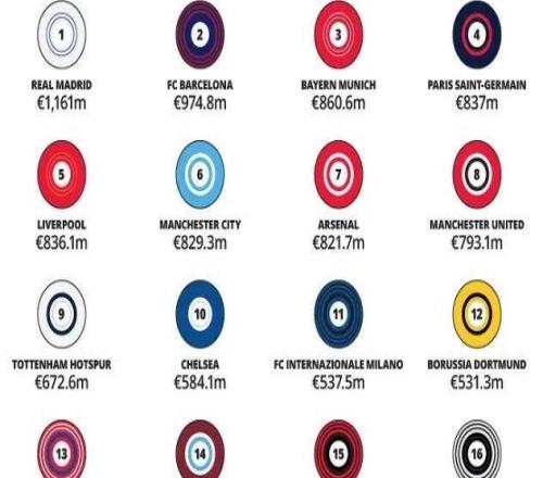 德勤足坛财富榜:皇马连续三年登顶,曼联跌至第八